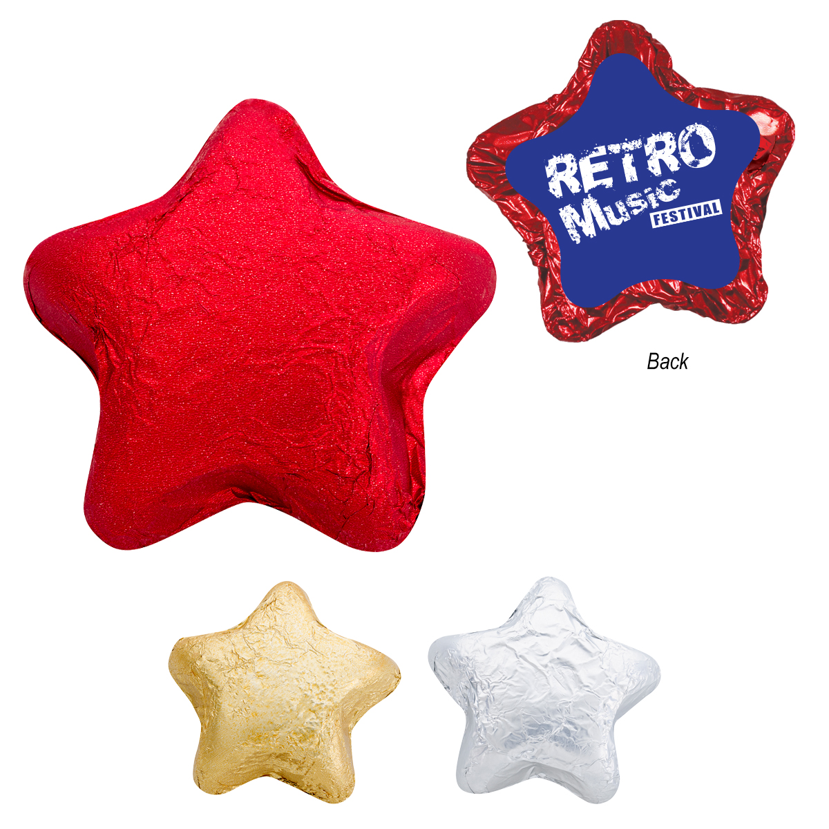 Individually wrapped milk chocolate candy stars branded with your logo in red, blue, silver, or gold wrapper.