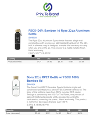 The Sona 22oz RPET Reusable Sports Bottle is single wall constructed and features a stylish FSC Certified bamboo lid. The body of the bottle is made from 100% recycled PET plastic. Through a partnership with 1% For The Planet, one percent of sales of EcoSmart products will be donated to nonprofits dedicated to protecting the planet.. Hand wash only. This product is not for hot beverages that are over 140 °F.