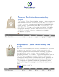 The Recycled Cotton Drawstring bag features a cinch closure and helps promote corporate social responsibility. It is manufactured from pre-consumer waste generate by factories during the fabric cutting process. Approximately 70%-80% recycled cotton and 20%-30% rPET. Through a partnership with 1% For The Planet, one percent of sales of this and all EcoSmart products will be donated to nonprofits dedicated to protecting the planet.
