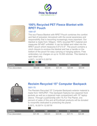 The eco Fleece Blanket with RPET Pouch combines the comfort and feel of polyester mircoplush with the social awareness and responsibility that is becoming increasingly more important. Our blanket is made from 180gsm, 100% recycled PET material and measures 50"x60" unfolded. It can be folded and rolled into the RPET pouch which measures 8.5"x13.5". The pouch contains a cinch closure to enclose the blanket and has a handle on the bottom of the pouch for easy carrying or hanging options. Free embroidery run charges on up to 10,000 stitches. This blanket is spot clean only.
