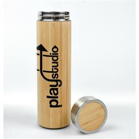 Sleek and contemporary, 15 oz.double-wall bottle, insulated bottle. Premium, 18/8 stainless steel inner wall and real bamboo outer wall keeps beverages hot and cold for up to 10-12 hours. FDA approved. Hand wash recommended.